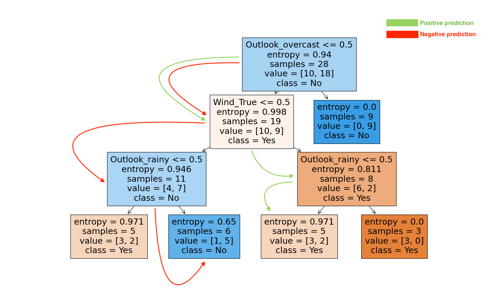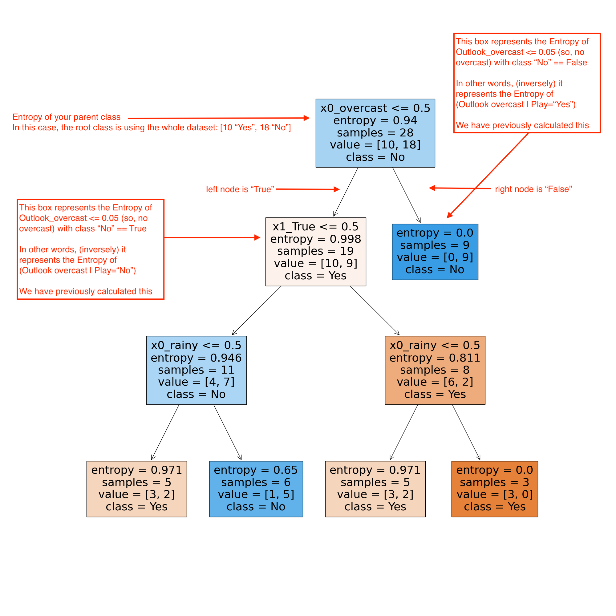 # probability of the class "No" p_No = 10 / 28 0.36 # probability of the class "Yes" p_Yes = 18 / 28 0.64 # calculate entropy import math entropy = -(p_No * math.log2(p_No) - p_Yes * math.log2(p_Yes)) print(round(entropy, 2)) 0.94 # calculate entropy using scipy from scipy.stats import entropy entropy = entropy([p_Yes, p_No], base=2) # base=2, because in the formula notation we use logarithmic base 2 print(round(entropy, 2)) 0.94