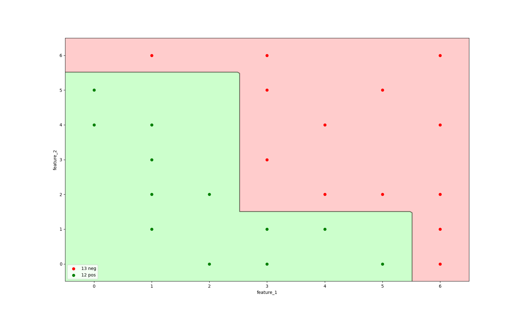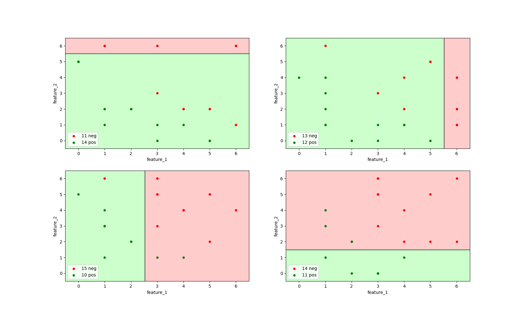 # max_features='sqrt' is the default for ensemble.RandomForestClassifier # line 337 in tree.DecisionTreeClassifier shows how max_features='sqrt' works n_features_in_ = 2 # feature_1, feature_2 print(max(1, int(np.sqrt(n_features_in_)))) 1 # since we want both feature_1 and feature_2, we choose max_features=2 from sklearn import ensemble rf_estimator = ensemble.RandomForestClassifier(n_estimators=4, criterion='entropy', max_features=2, bootstrap=True) rf_estimator.fit(X=df[['feature_1', 'feature_2']].values, y=df[['label']].values)